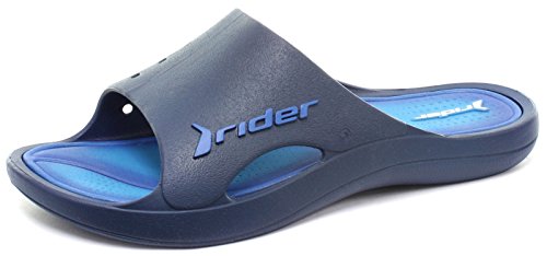 NEW FOR 2016!!! The Rider Bay V is a comfortable, water-friendly, easy to slip on slide sandal that keeps your feet dry. It is designed with dry-eco foam water repellent cushioning technology for the ultimate in comfort. The super soft foam footbed on this sandal is so comfortable you could be walking on air. This eco-friendly sandal is ideal for wearing around the pool, on the beach, and in the shower as it is waterproof, quick drying, and easy to clean. Made in Brazil! Made from 100% recyclable materials. Injection moulded from waterproof materials, features strategically placed drainage holes on both sides of the wide strap to keep feet dry. Also features the Rider brand name on the wide strap and on the insole. The textured dry-eco foam cushioned footbed offers comfort as well as moisture management. The unique sole also provides great arch support. The non slip flexible rubber outsole delivers exceptional grip as well as durability.